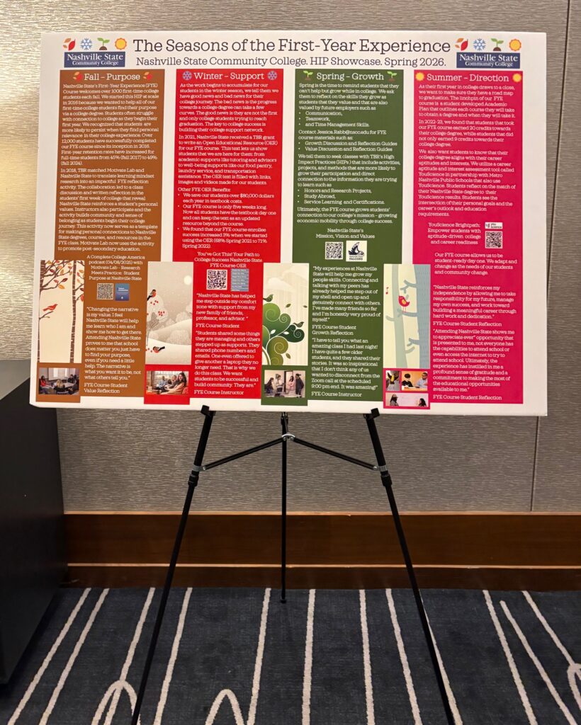 At the TBR annual Statewide Outstanding Achievement Recognition (SOAR) awards in March, each college had an opportunity to showcase a high impact practice via a poster, and the Nashville State poster on our NSCC 1010 First Year Experience course received the ‘Gold’ Award.